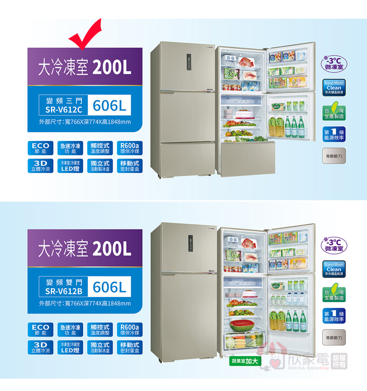 容量:606L (冷凍室 200L/冷藏室 276L/蔬果室 130L)