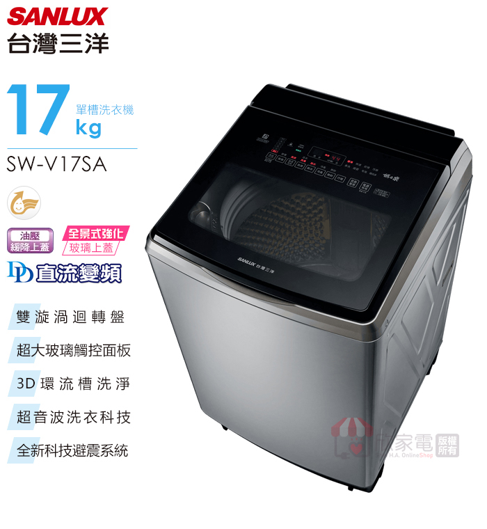 SANLUX 台灣三洋 17KG DD直流變頻超音波單槽洗衣機-不鏽鋼