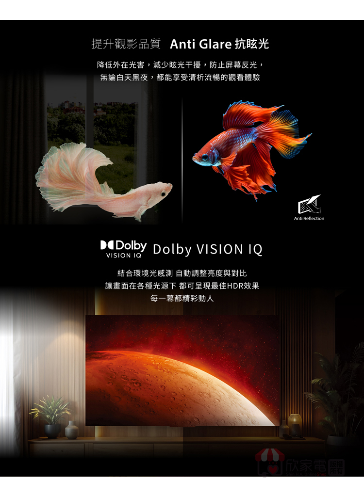 影音觀賞模式:User, Standard, Vivid, Sports, Movie, Game, Eco;Dolby Vision IQ / Dark / Vivid / Game