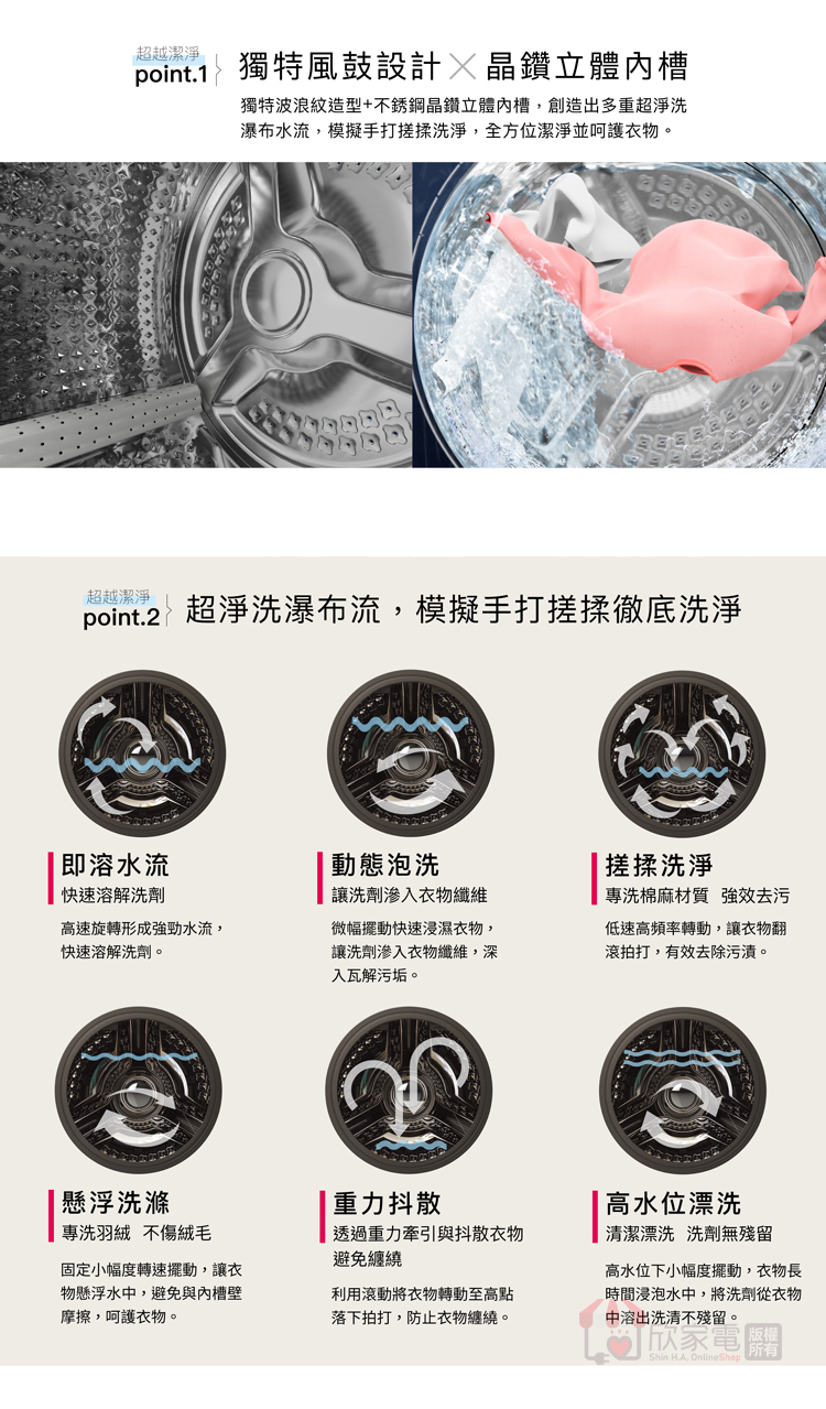 洗衣行程:10種:棉質衣物(Cotton)、ECO節能(ECO)、快洗15分鐘/Super Quick、洗清脫水(Rinse+Spin)、羊毛衣物(Wool)、柔順(Scent)、抗敏護理(Allergy)、抑菌護理(Hygiene)、寢具(Bedding)、槽洗淨