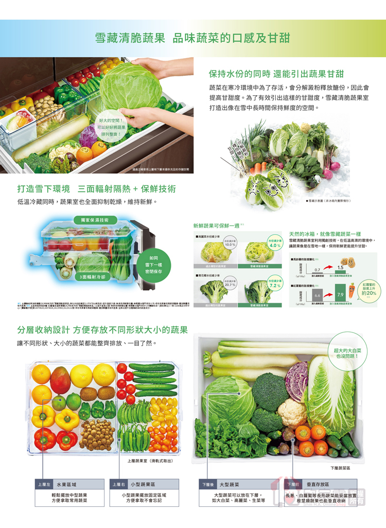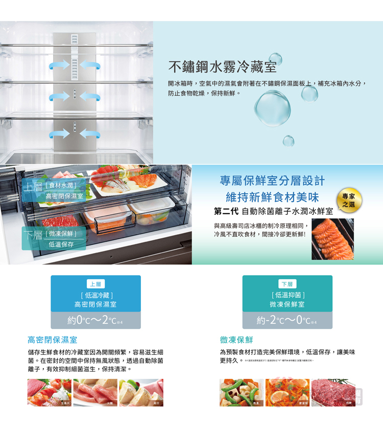 水潤冰鮮室:第二代水潤冰鮮室 (上層:0°C-2°C高密閉保濕式 /下層:-2°C-0°C微凍保鮮室)