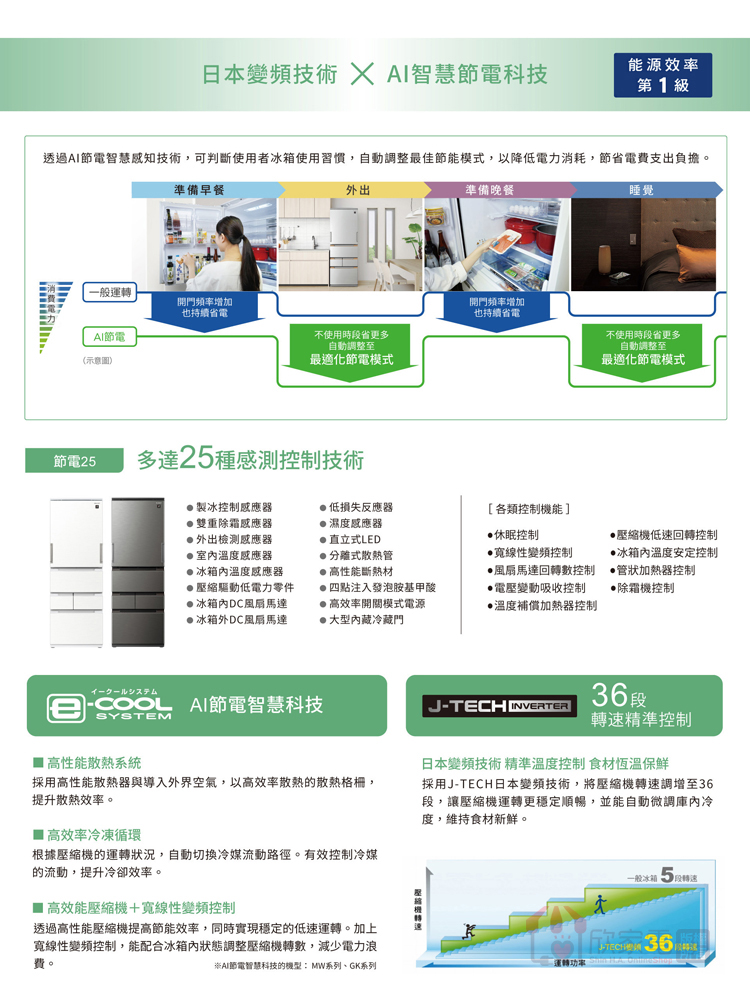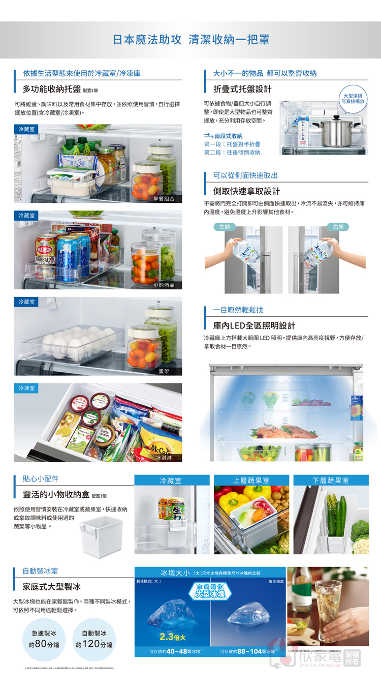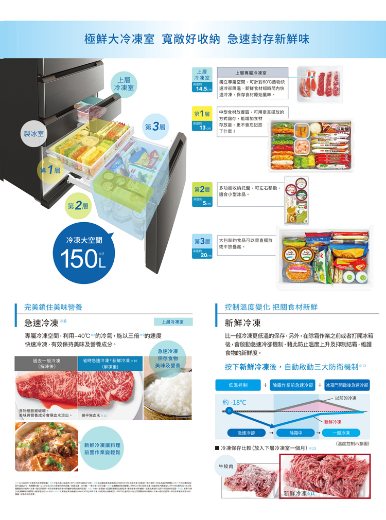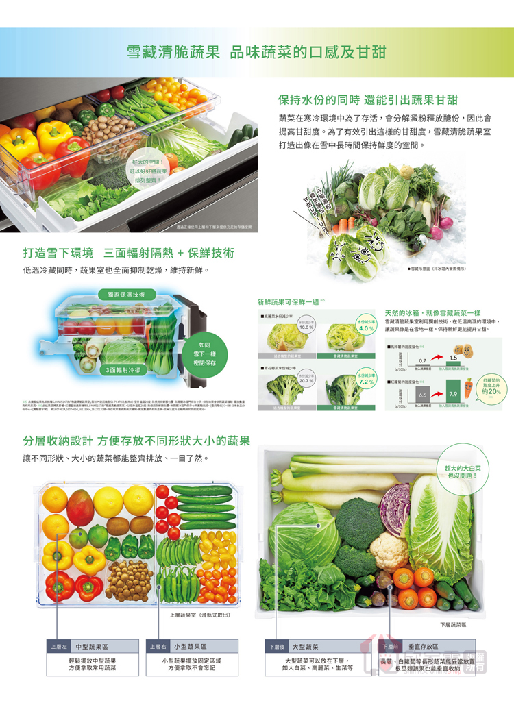 水潤冰鮮室:第二代水潤冰鮮室 (上層:0°C-2°C高密閉保濕式 /下層:-2°C-0°C微凍保鮮室)