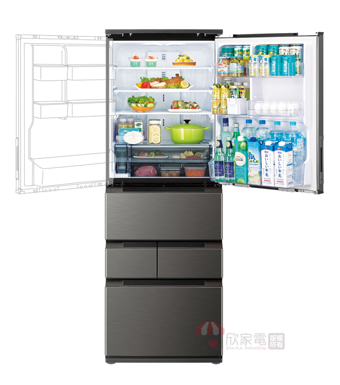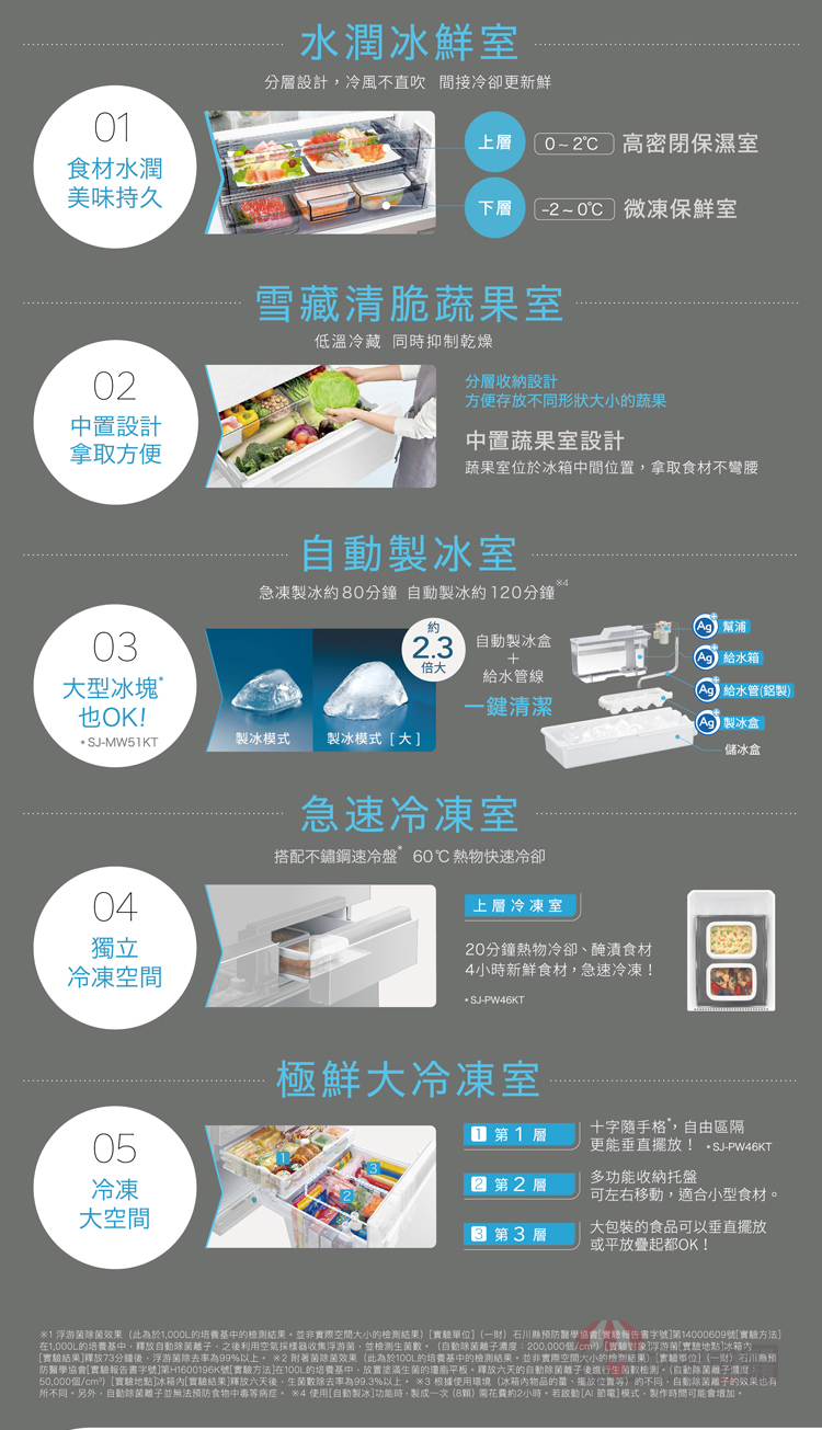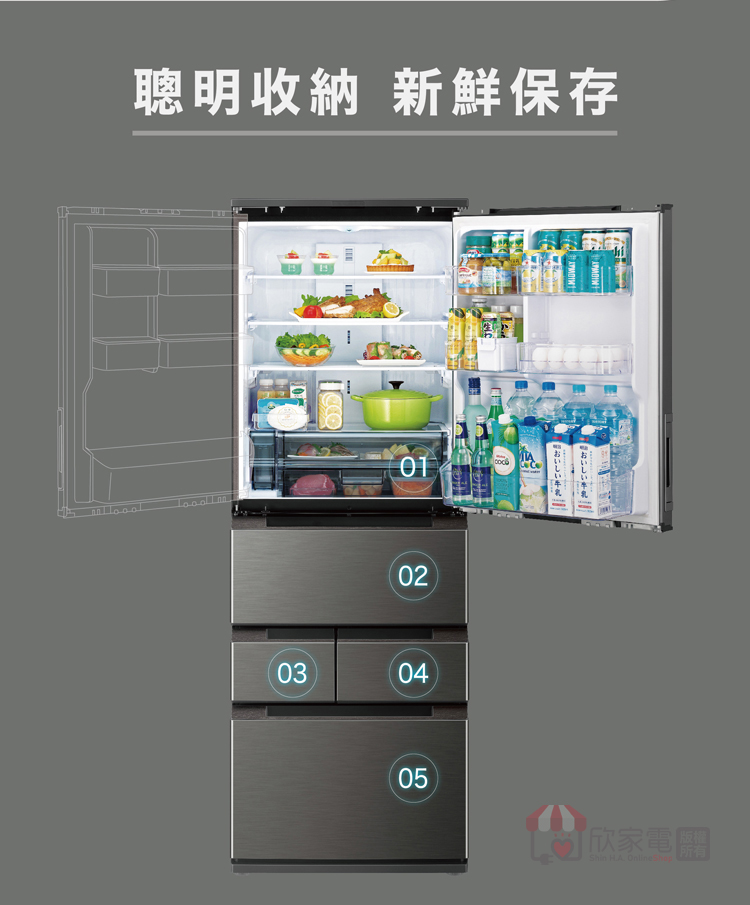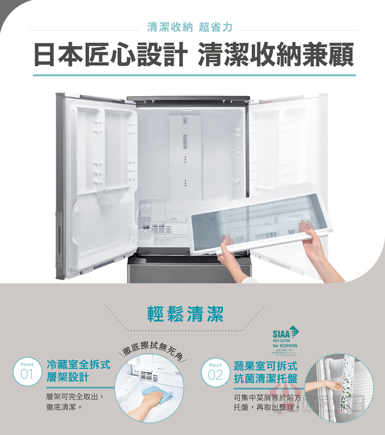 水潤冰鮮室:第二代水潤冰鮮室 (上層:0°C-2°C高密閉保濕式 /下層:-2°C-0°C微凍保鮮室)