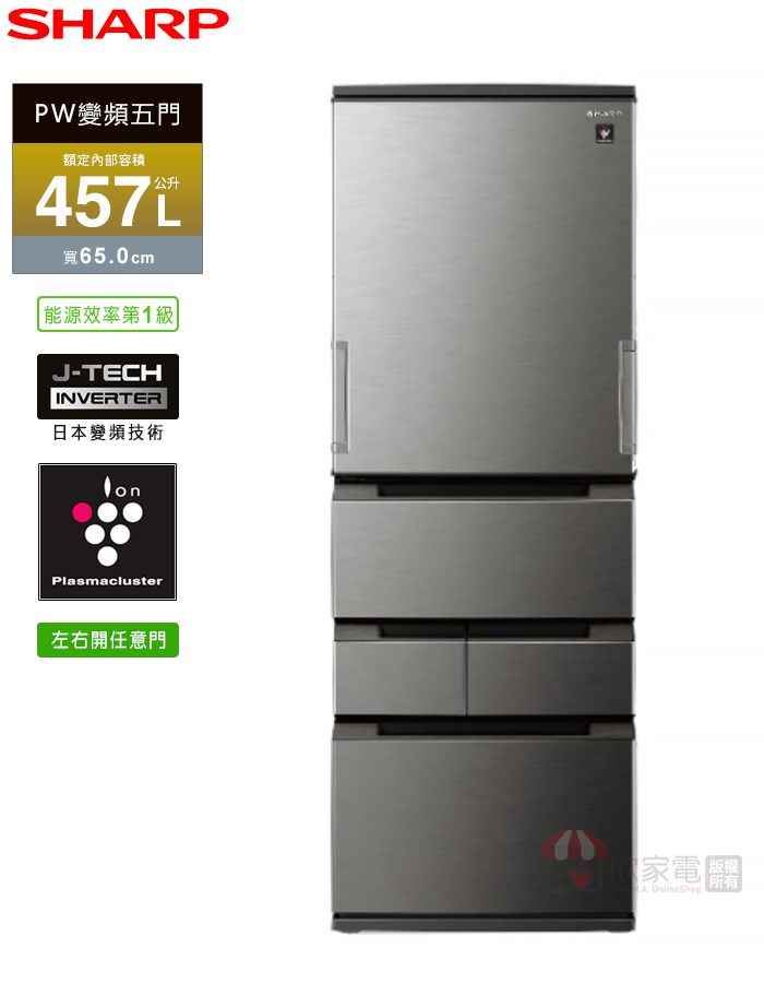 SHARP 夏普 457L 變頻自動除菌離子左右開任意門五門冰箱 -尊爵灰