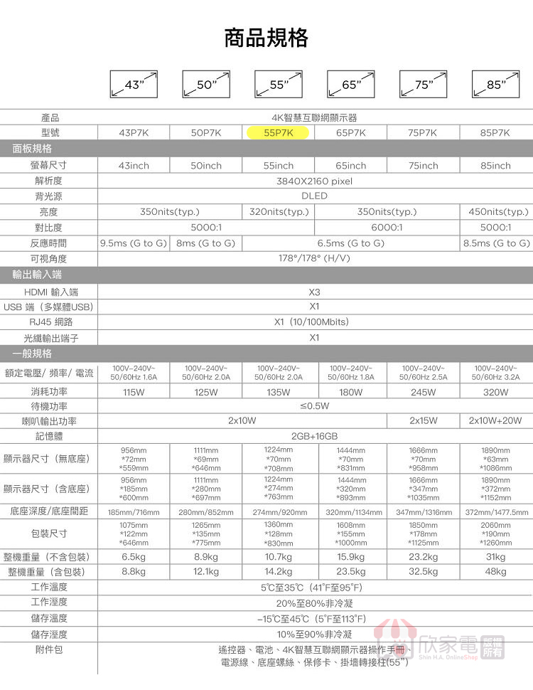 顯示器尺寸(無底座) (WxHxD):1224*708*70 (mm)