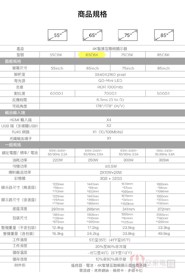 顯示器尺寸(無底座) (WxHxD):1447*832*56 (mm)