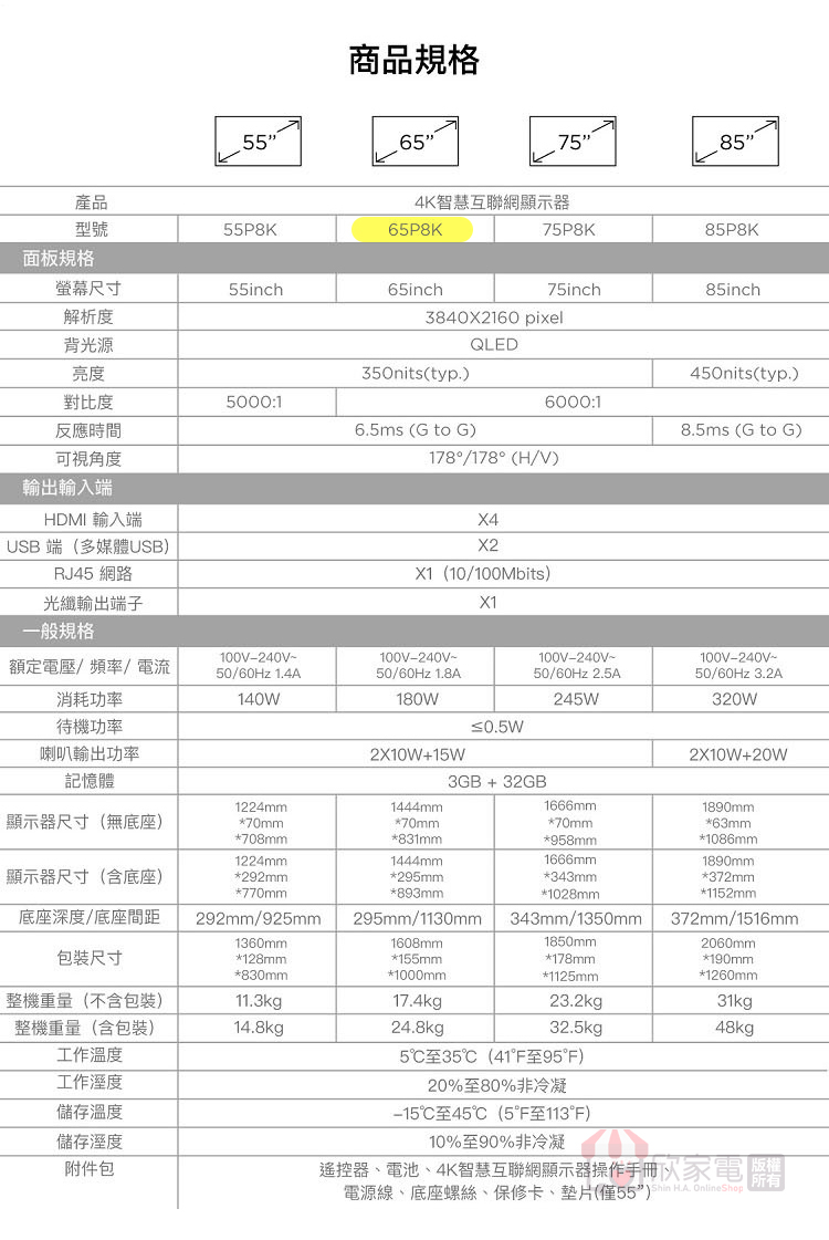 TCL 65型【P8K系列】4K QLED Google TV 量子智能連網液晶顯示器