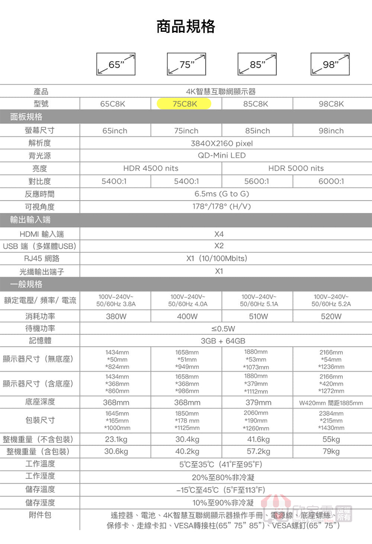 顯示器尺寸(含底座) (WxHxD):1658*986*368 (mm)