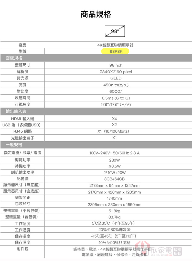 顯示器尺寸(含底座) (WxHxD):2178*1285*420 (mm)