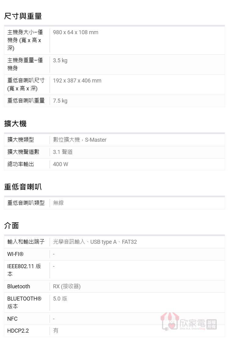 重低音喇叭尺寸 (寬 x 高 x 深):192 x 387 x 406 mm