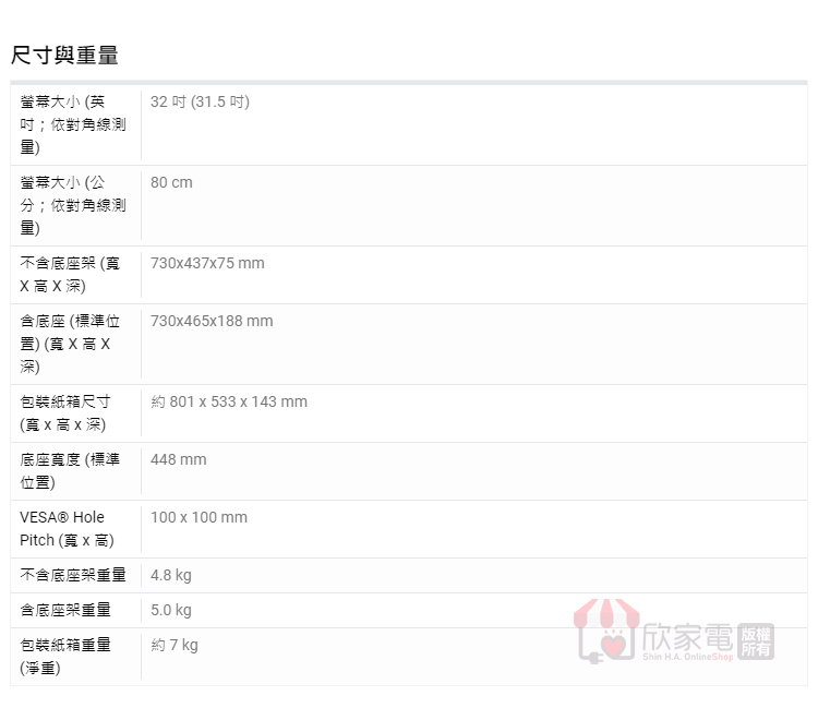 螢幕大小 (英吋;依對角線測量):32 吋 (31.5 吋)