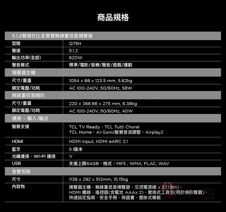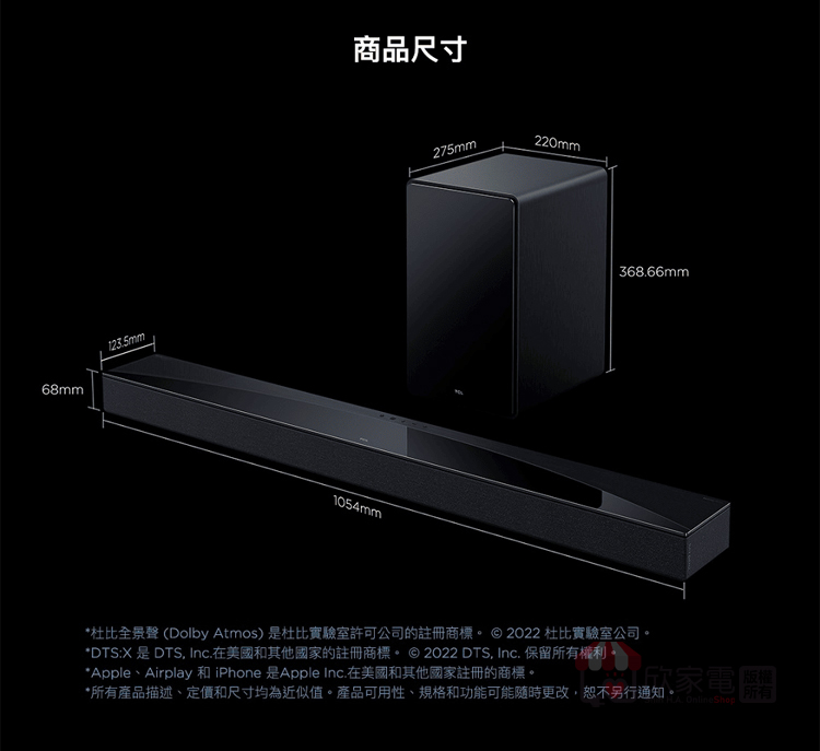 條形音箱尺寸:1054 x 68 x 123.5 mm