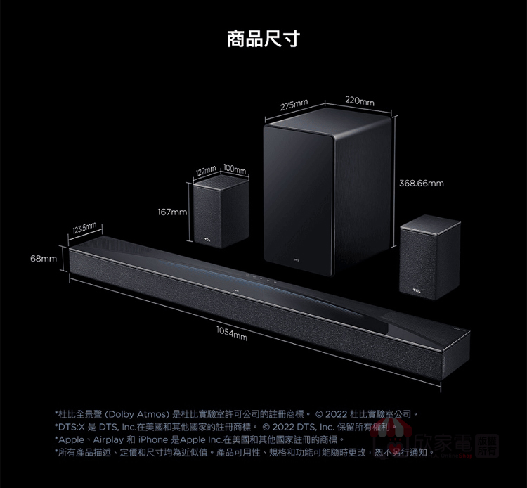 條形音箱尺寸:1054 x 68 x 123.5 mm