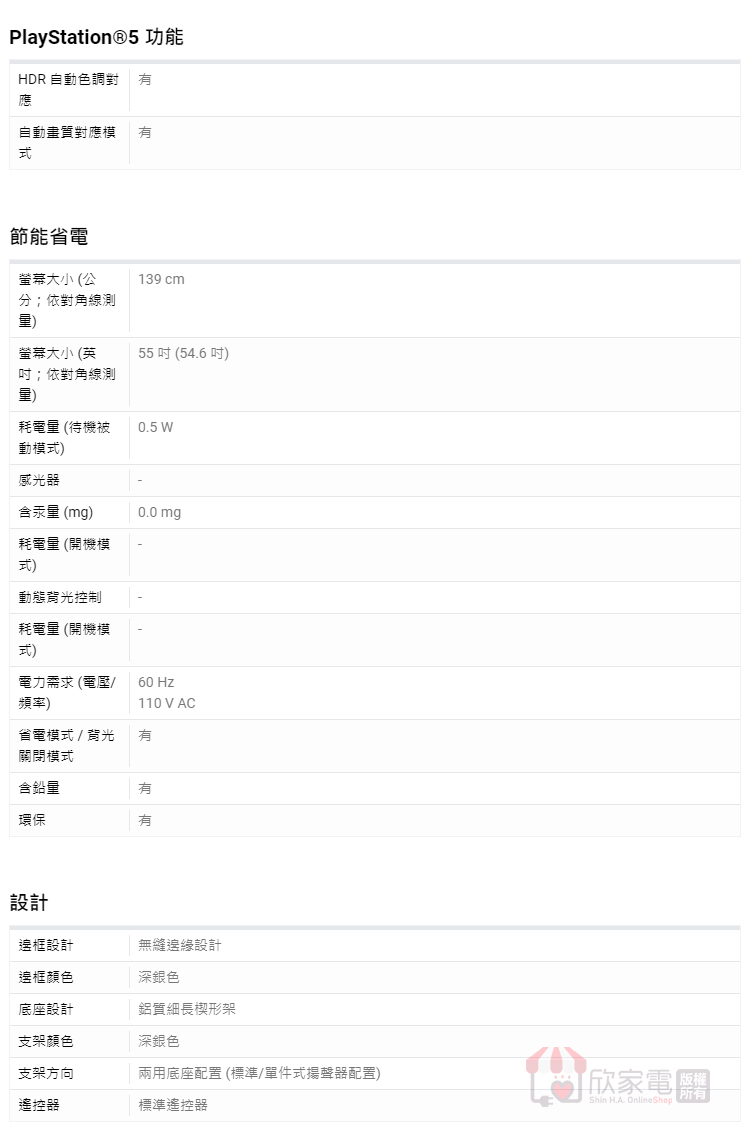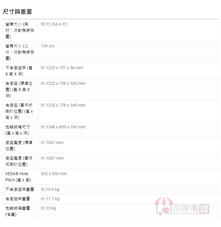 螢幕大小 (英吋;依對角線測量):55 吋 (54.6 吋)