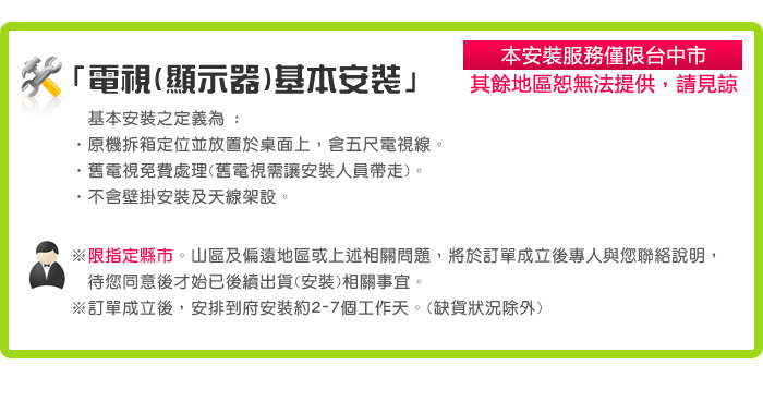 ※安裝處若無電梯需收取樓層搬運費,請至站內分類:其他服務「樓層費」加購。