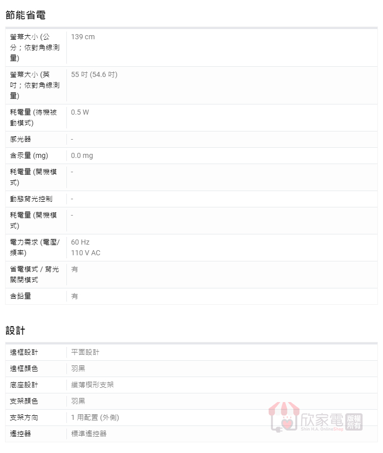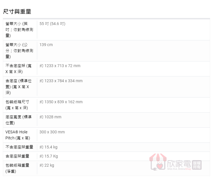 螢幕大小 (英吋;依對角線測量):55 吋 (54.6 吋)