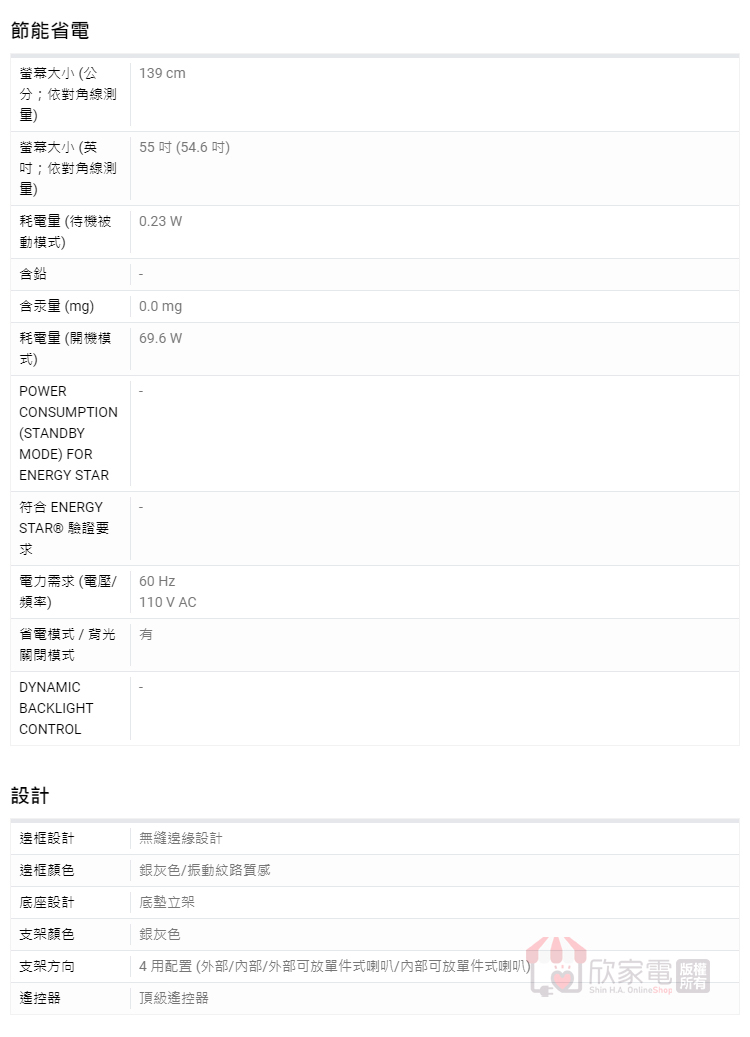 螢幕大小 (英吋;依對角線測量):55 吋 (54.6 吋)