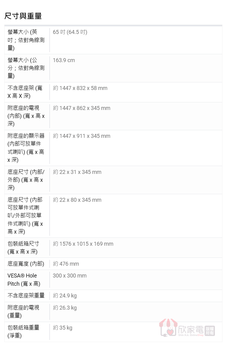 螢幕大小 (公分;依對角線測量):163.9 cm