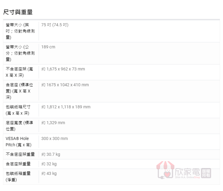 螢幕大小 (英吋;依對角線測量):75 吋 (74.5 吋)