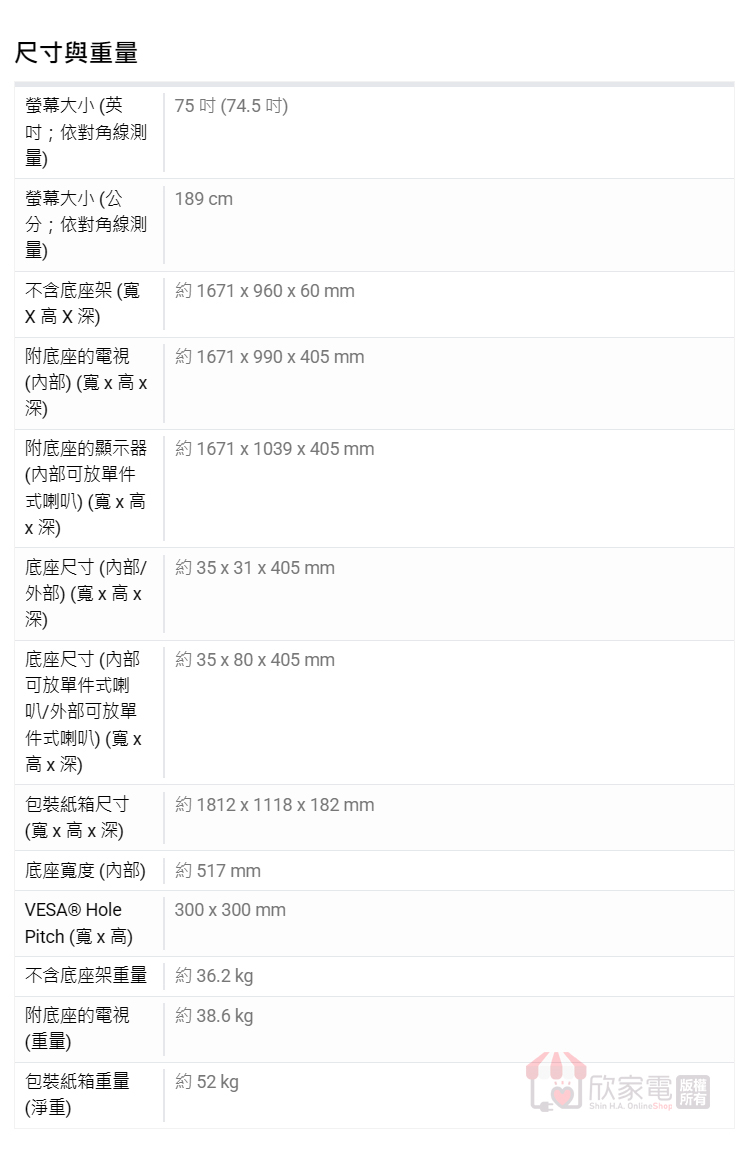 底座寬度 (內部):約 517 mm VESA® Hole Pitch (寬 x 高):300 x 300 mm