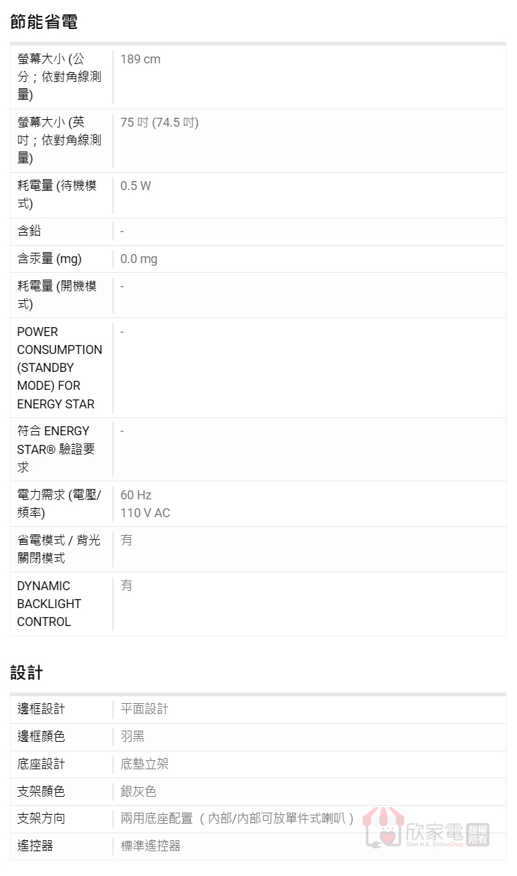 螢幕大小 (英吋;依對角線測量):75 吋 (74.5 吋)