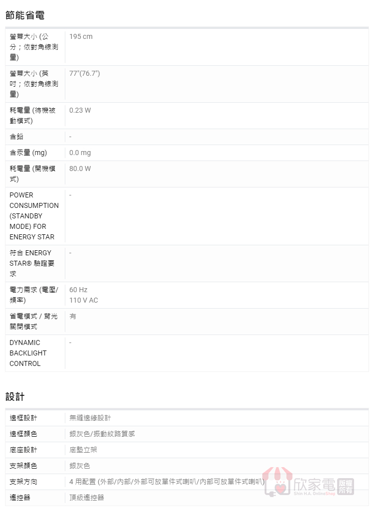 螢幕大小 (英吋;依對角線測量):77"(76.7")