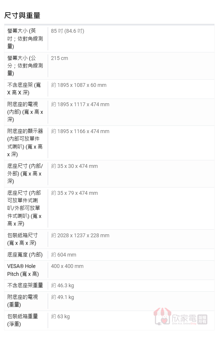 螢幕大小 (英吋;依對角線測量):85 吋 (84.6 吋)