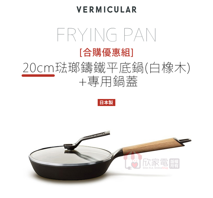 【1+1合購優惠組】 日本 Vermicular 20CM琺瑯鑄鐵平底鍋 (白橡木) + 專屬鍋蓋