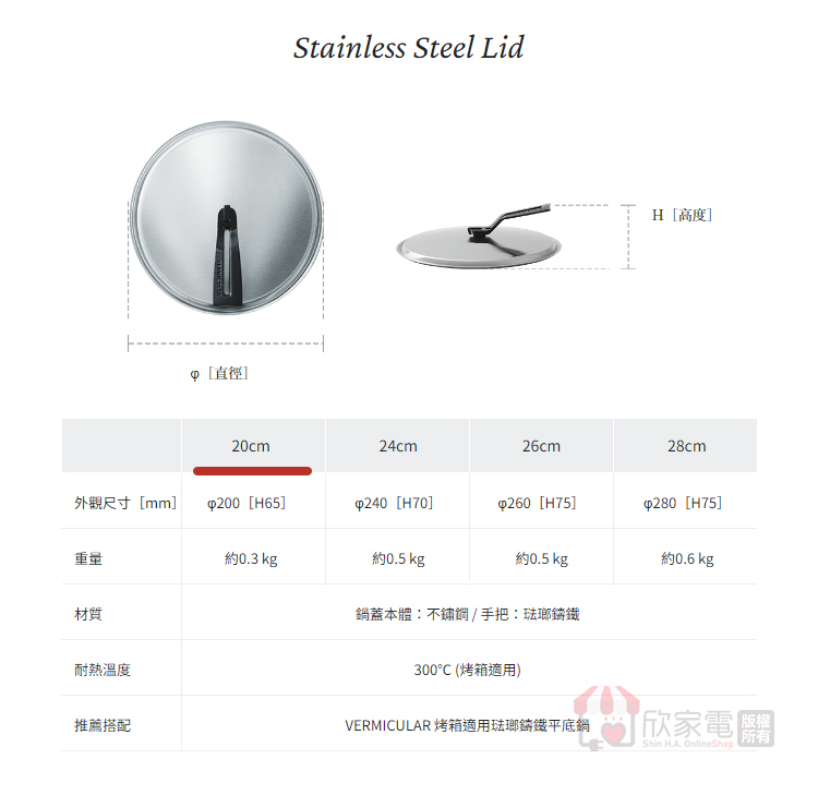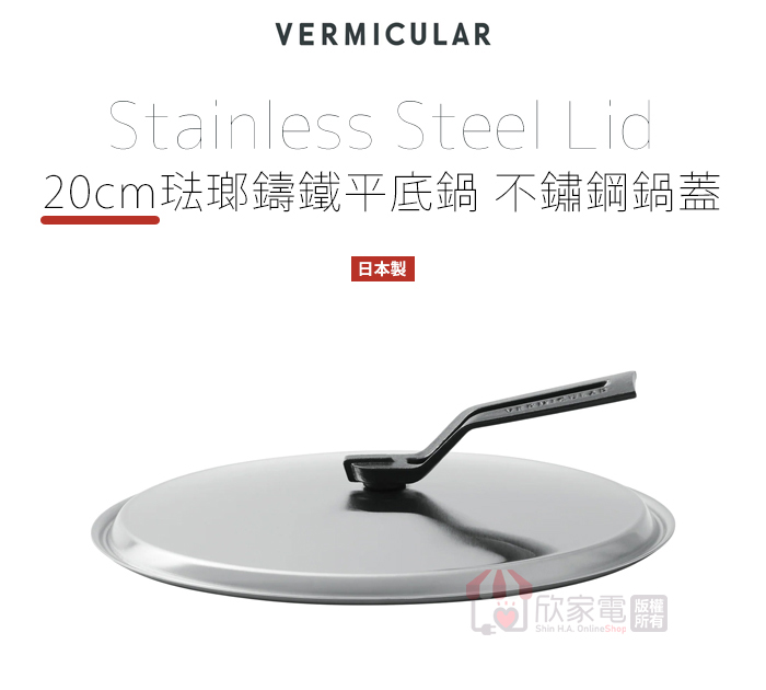 日本 Vermicular 20CM琺瑯鑄鐵平底鍋 專用不鏽鋼鍋蓋
