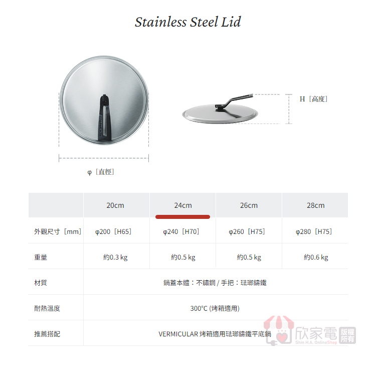 日本 Vermicular 24CM琺瑯鑄鐵平底鍋 專用不鏽鋼鍋蓋