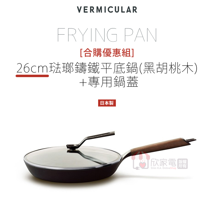 【1+1合購優惠組】 日本 Vermicular 26CM琺瑯鑄鐵平底鍋 (黑胡桃木) + 專屬鍋蓋