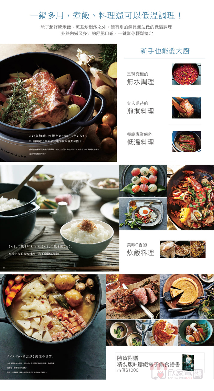 內容物:包含IH加熱器乙個、19CM琺瑯鑄鐵鍋乙個、專用鍋蓋座乙個、專用量杯兩個、192頁專屬食譜書乙本
