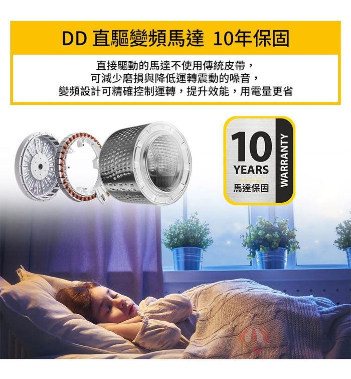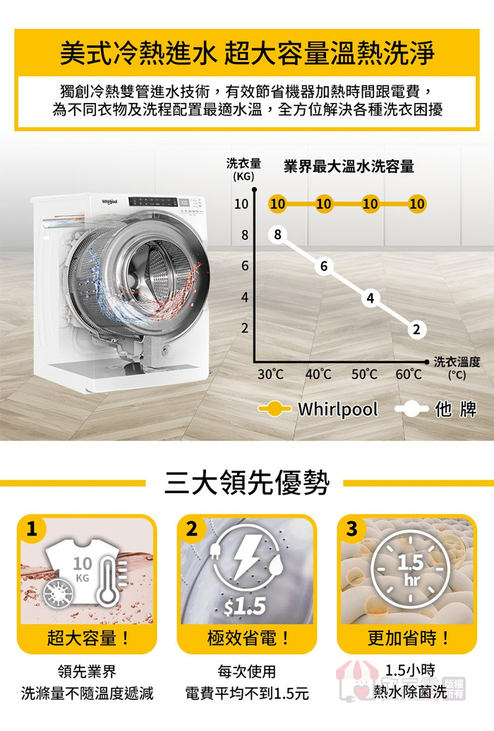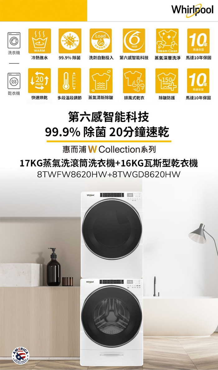 *美國製滾筒洗衣機/乾衣機系列(8T字首型號)、中國製變頻洗衣機系列,主動力馬達保固10年,其餘同Whirlpool該品類保固(詳細型號請參見官網資訊)