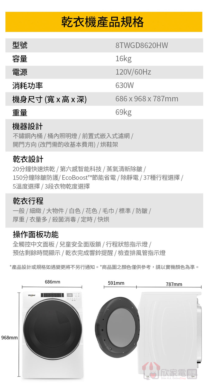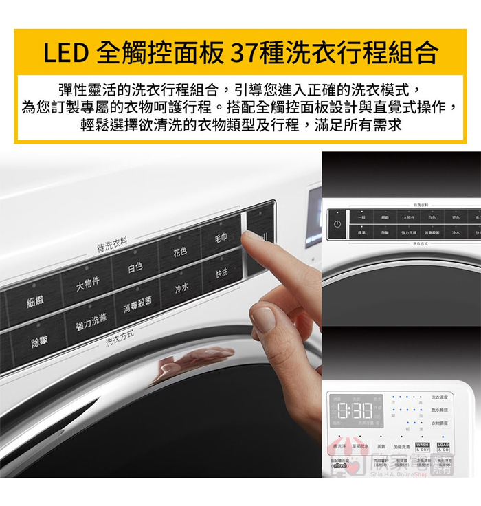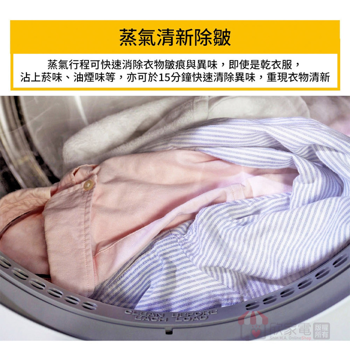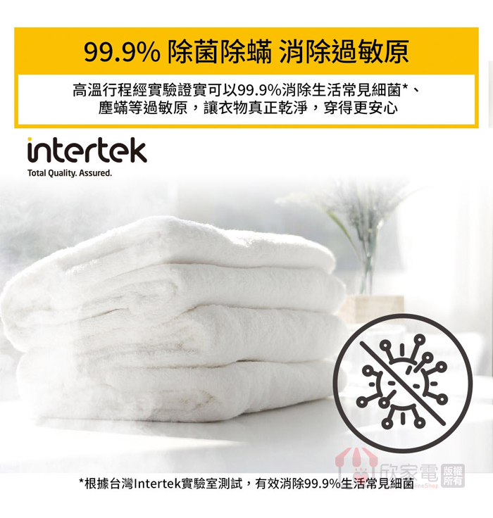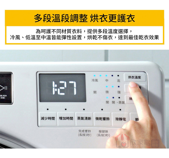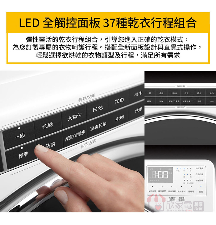 行程:少量快烘、厚重衣物、細緻衣物、白色衣物、花色衣物、消毒殺菌、防皺、定時乾衣、ECO節能乾衣、冷風乾衣