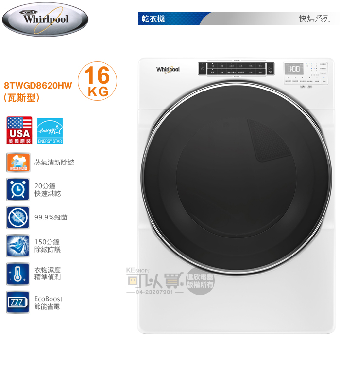 Whirlpool 惠而浦 16KG 美製 37行程快烘滾筒式乾衣機-瓦斯型