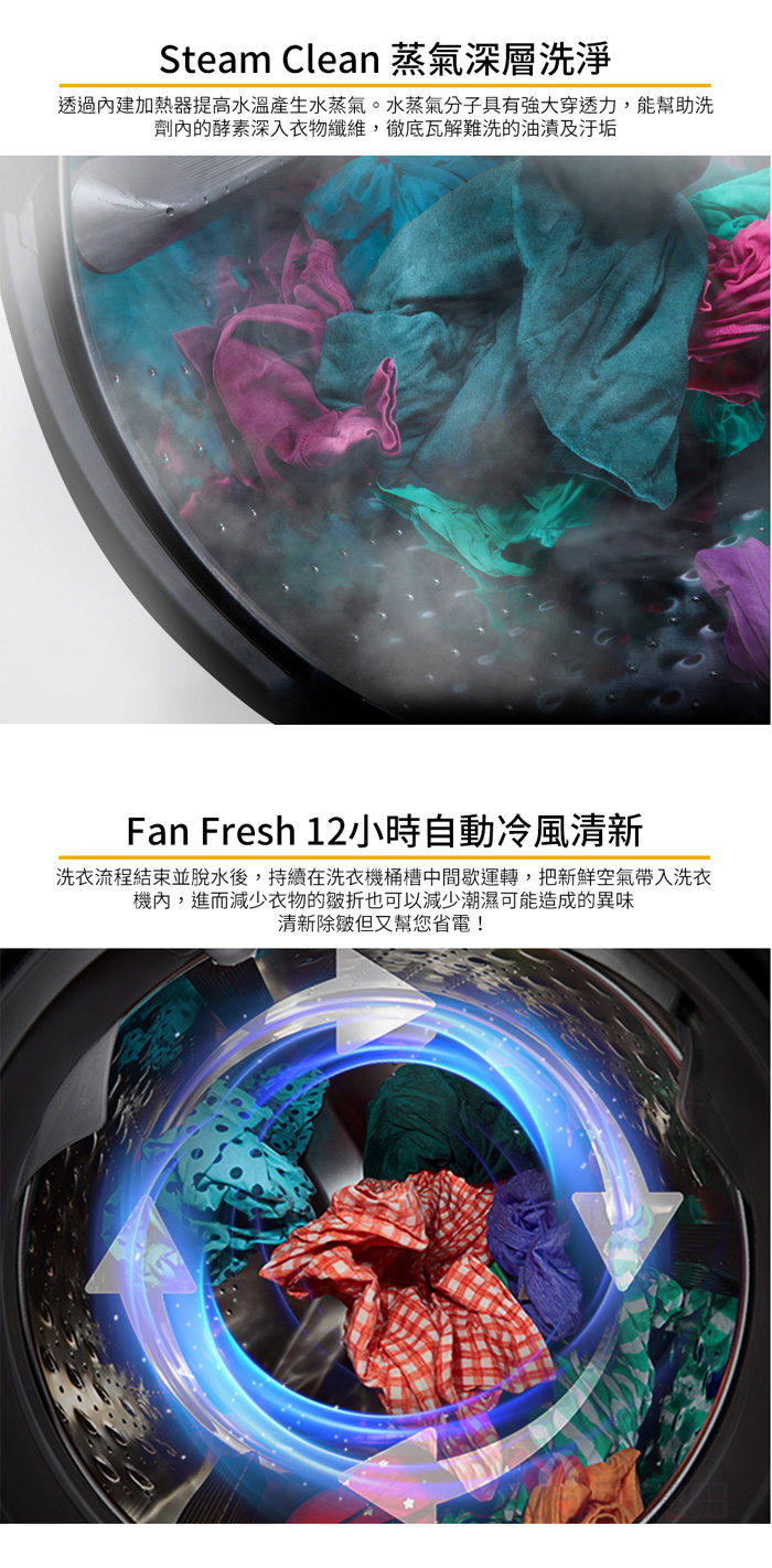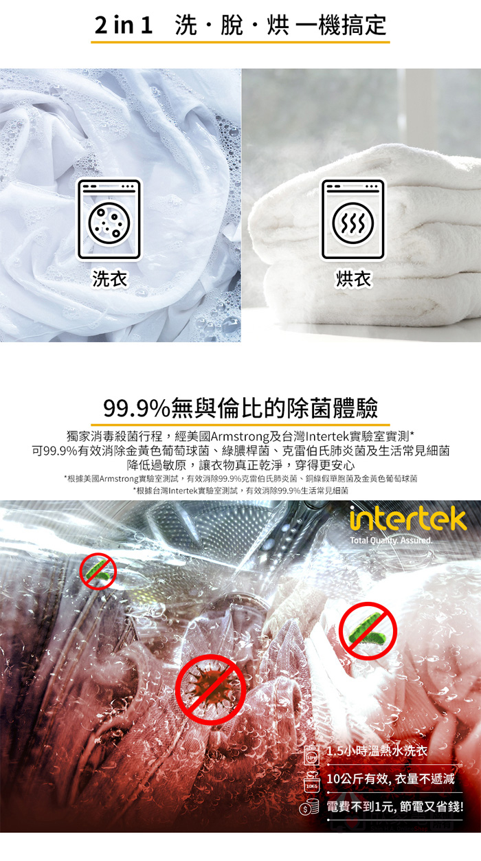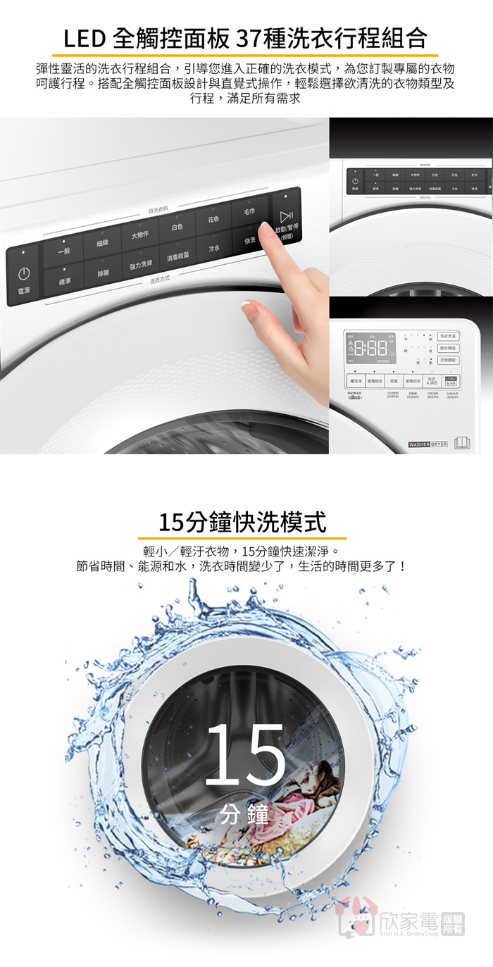 一般、細緻、厚重/衣量多、白色、花色、毛巾、標準、強力洗滌、殺菌消毒、冷水、快洗、單獨脫水、 單獨烘衣、洗衣&烘衣、Affresh槽洗淨