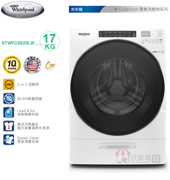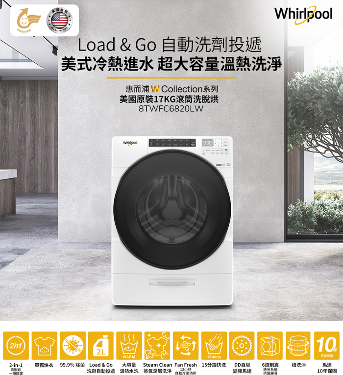 Whirlpool 惠而浦 17KG 美製 Load & Go 蒸氣洗滾筒洗脫烘