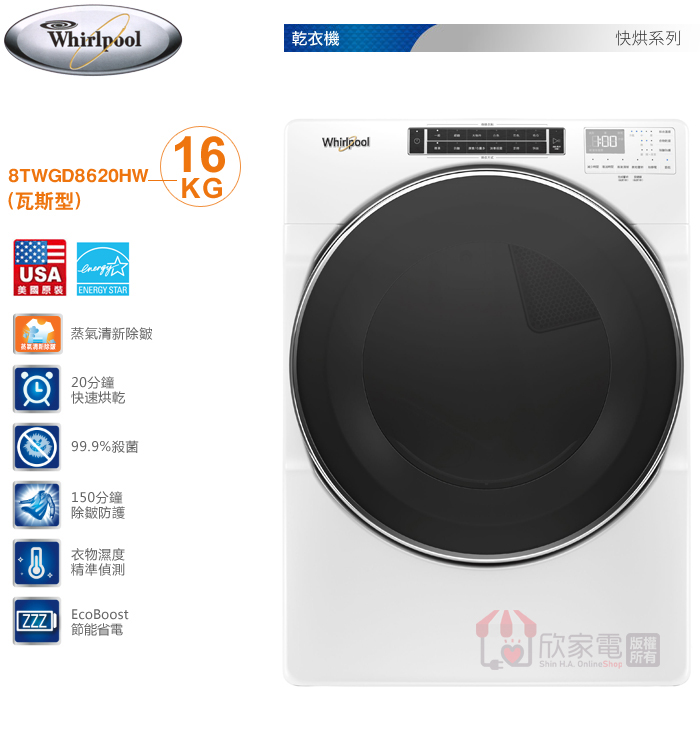 Whirlpool 惠而浦 16KG 美製 37行程快烘滾筒式乾衣機-瓦斯型