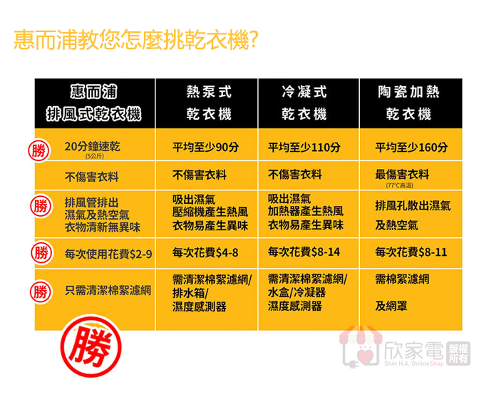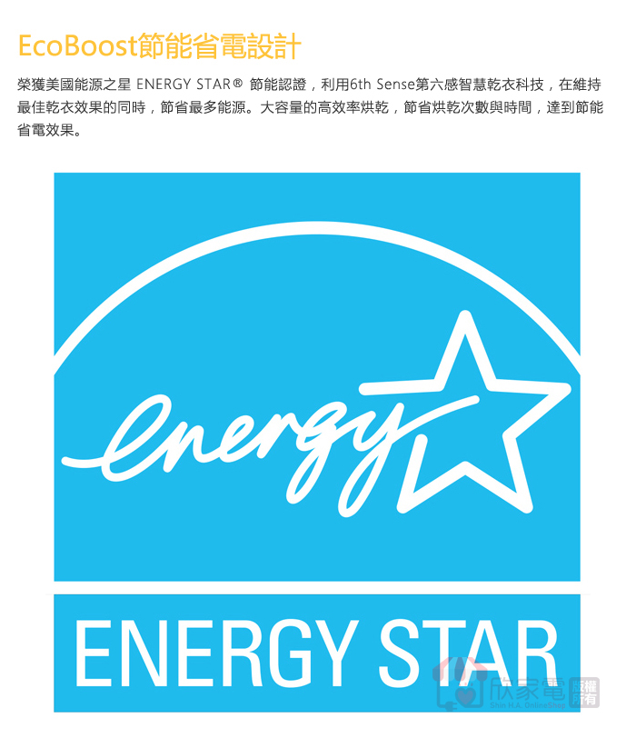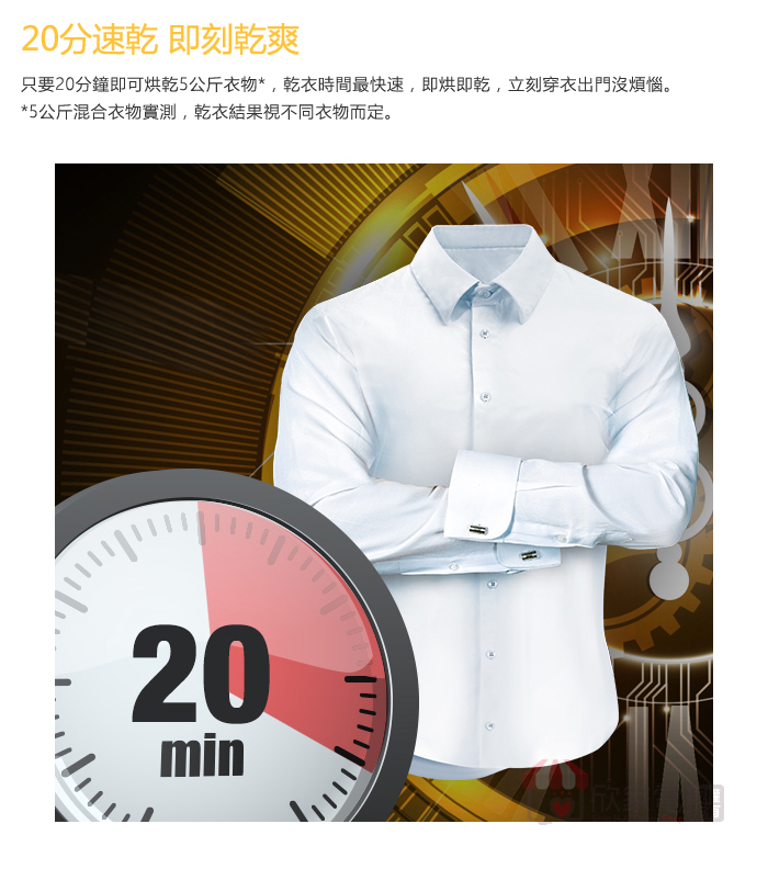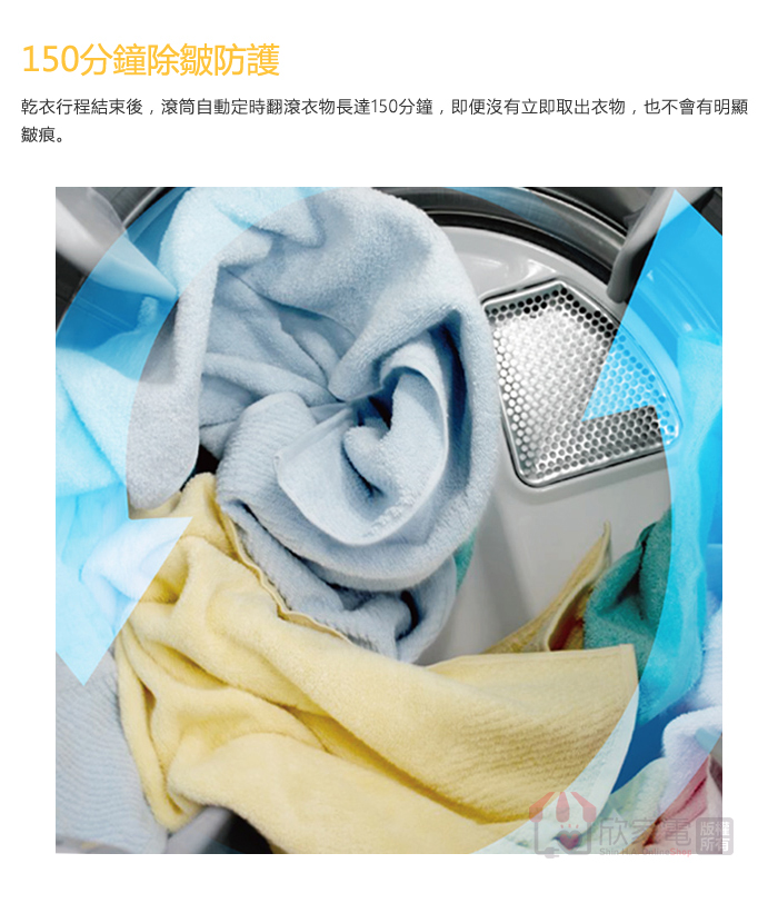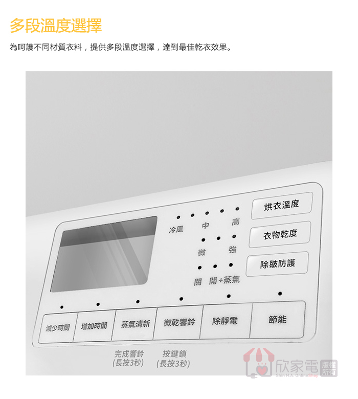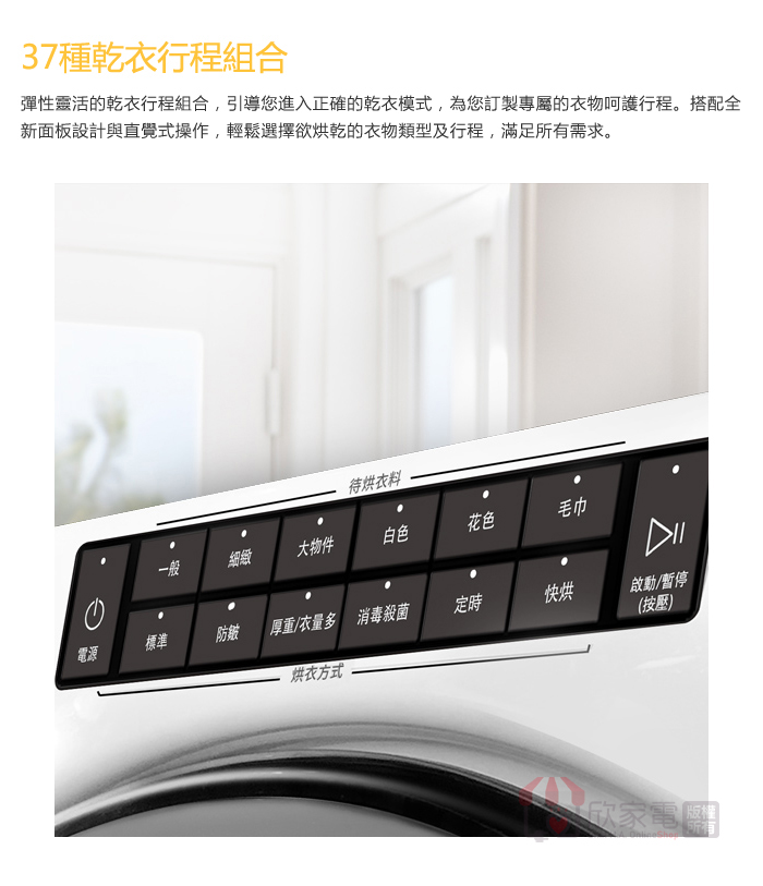 行程:少量快烘、厚重衣物、細緻衣物、白色衣物、花色衣物、消毒殺菌、防皺、定時乾衣、ECO節能乾衣、冷風乾衣